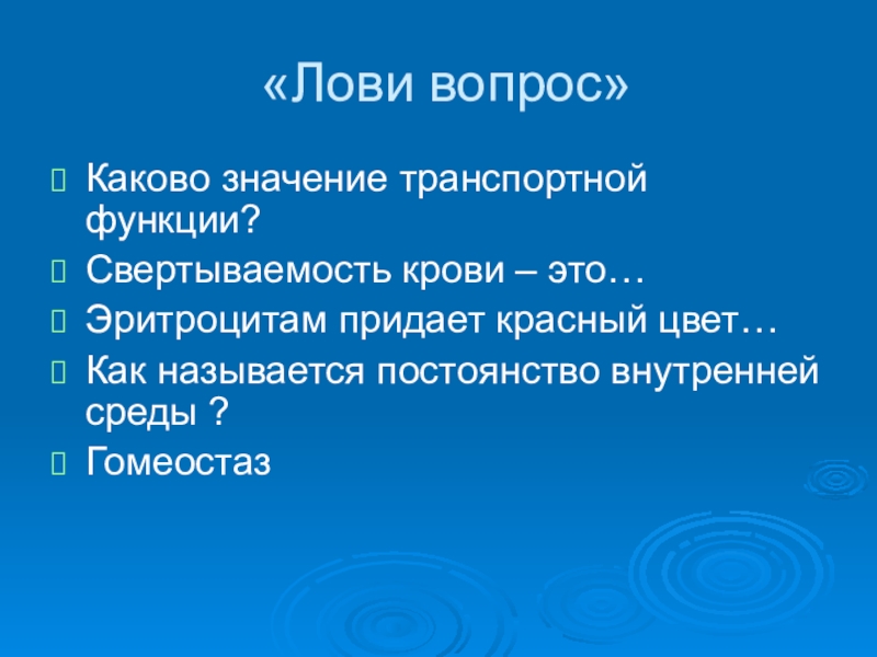 «Лови вопрос»Каково значение транспортной функции? Свертываемость крови – это… Эритроцитам придает красный цвет… Как называется постоянство внутренней