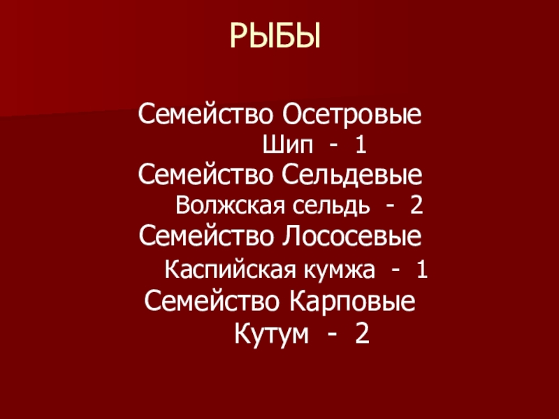 РЫБЫСемейство Осетровые     Шип - 1Семейство Сельдевые   Волжская сельдь - 2Семейство Лососевые