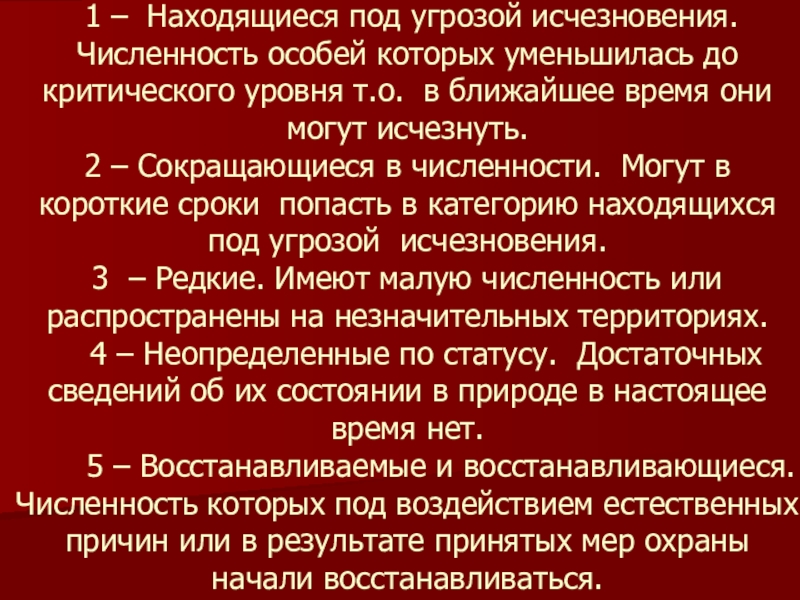 до критического уровня т.о. в ближайшее время они могут исчезнуть. 2 – Сокращающиеся в численности. Могут в короткие сроки попасть в категорию находящихся под угрозой исчезновения. 3 – Редкие. Имеют малую численность или распространены на незначительных территориях. 4 – Неопределенные по статусу. Достаточных сведений об их состоянии в природе в настоящее время нет. 5 – Восстанавливаемые и восстанавливающиеся. Численность которых под воздействием естественных причин или в результате принятых мер охраны начали восстанавливаться.