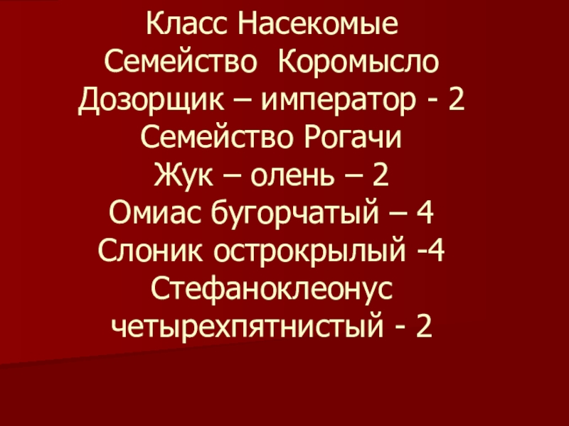 Класс Насекомые Семейство Коромысло Дозорщик – император - 2 Семейство Рогачи Жук – олень – 2 Омиас