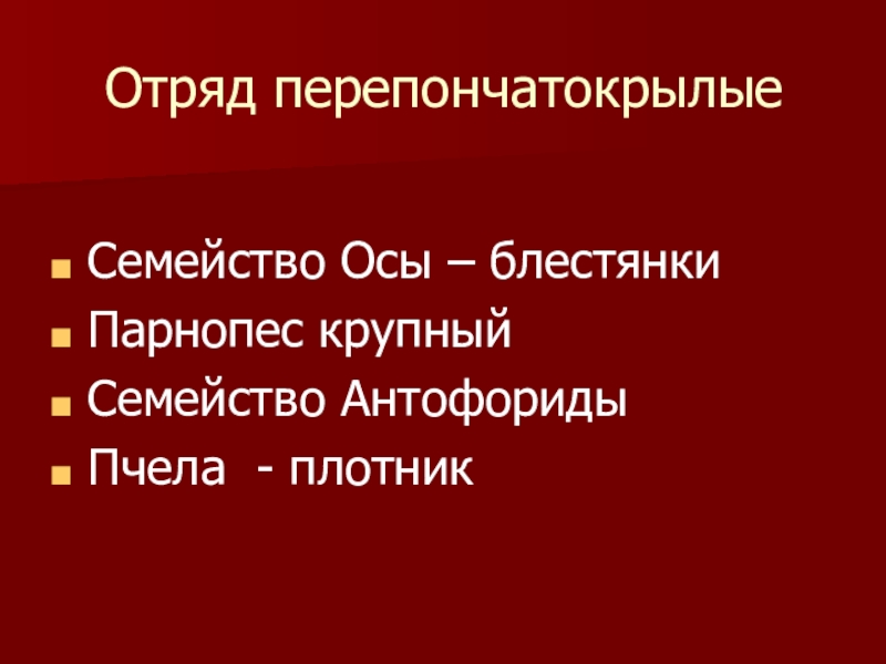 Отряд перепончатокрылыеСемейство Осы – блестянкиПарнопес крупныйСемейство АнтофоридыПчела - плотник