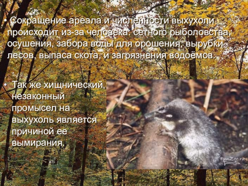 Сокращение ареала и численности выхухоли происходит из-за человека: сетного рыболовства, осушения, забора воды для орошения, вырубки лесов, выпаса скота, и загрязнения водоёмов.