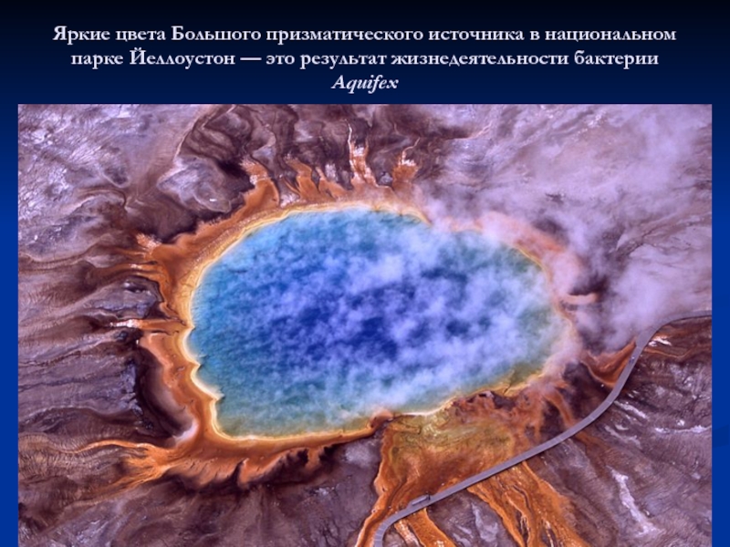 Слайд 26Яркие цвета Большого призматического источника в национальном парке Йеллоустон — это результат