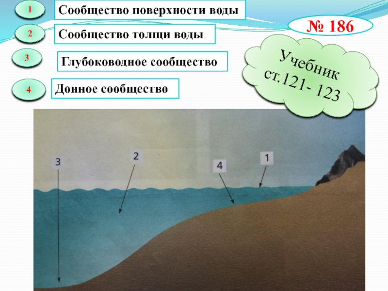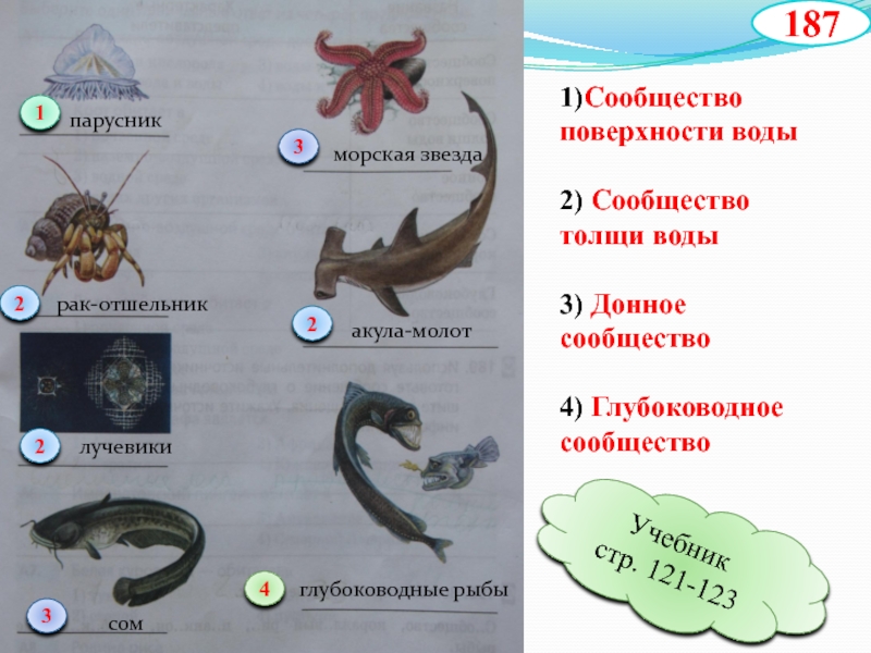 сообщество поверхности воды, сообщество толщи воды, донное сообщество, глубоководное сообщество, сообщество кораллового рифа