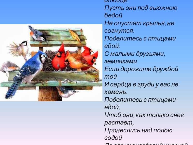 Поделитесь с птицами едойНакрошите хлеба им на блюдце.Пусть они под вьюжною бедойНе опустят крылья, не согнутся.Поделитесь с