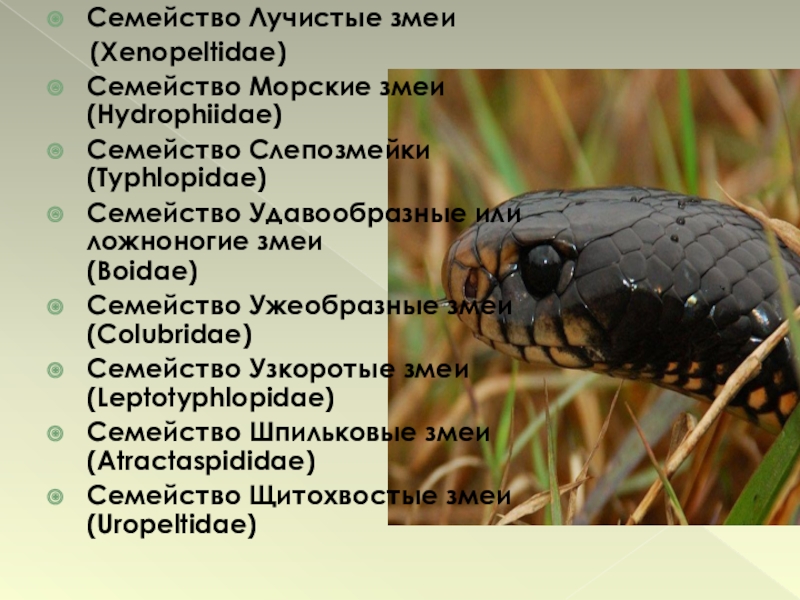 Семейство Лучистые змеи   (Xenopeltidae)Семейство Морские змеи (Hydrophiidae)Семейство Слепозмейки  (Typhlopidae)Семейство Удавообразные или ложноногие змеи  (Boidae)Семейство Ужеобразные