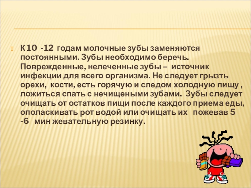 К 10 -12 годам молочные зубы заменяются постоянными. Зубы необходимо беречь.