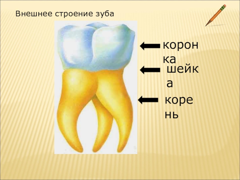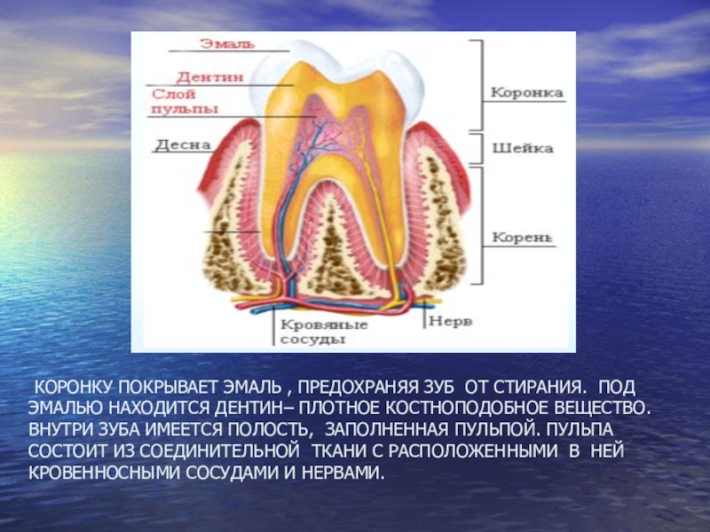Слайд 21 КОРОНКУ ПОКРЫВАЕТ ЭМАЛЬ , ПРЕДОХРАНЯЯ ЗУБ ОТ СТИРАНИЯ. ПОД ЭМАЛЬЮ