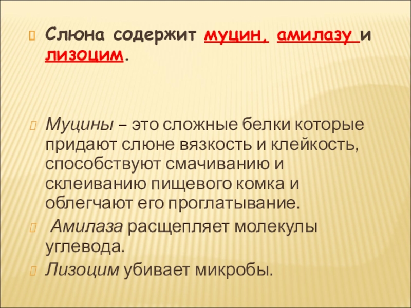 Слайд 17Слюна содержит муцин, амилазу и лизоцим.