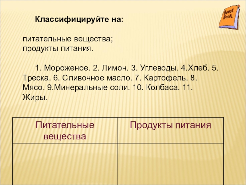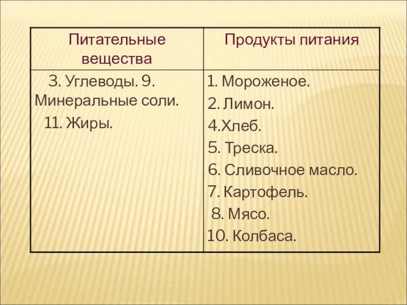 4.Хлеб. 5. Треска. 6. Сливочное масло. 7. Картофель. 8. Мясо. 9.Минеральные соли. 10. Колбаса. 11. Жиры.