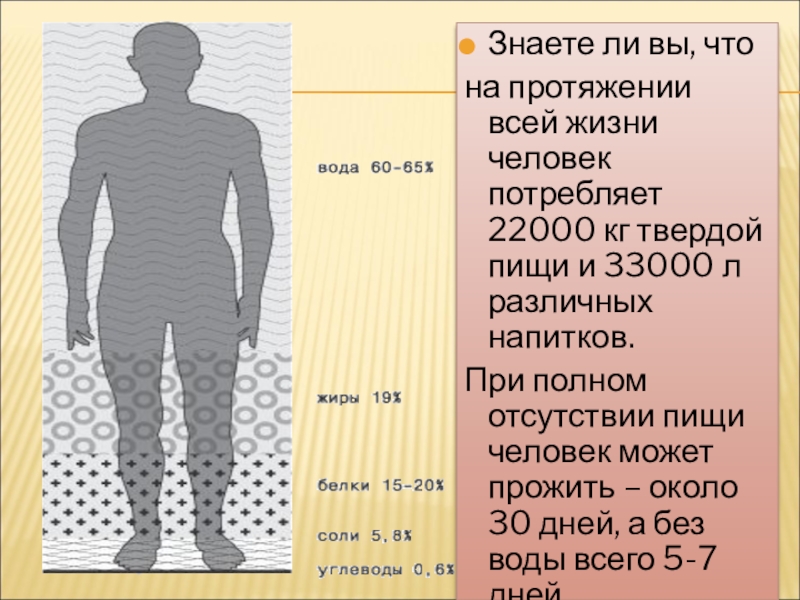 При полном отсутствии пищи человек может прожить – около 30 дней, а без воды всего 5-7 дней.