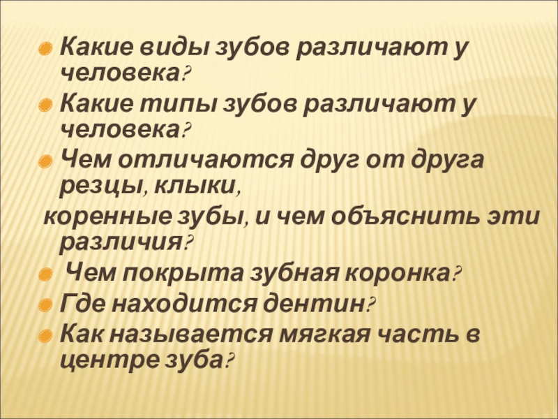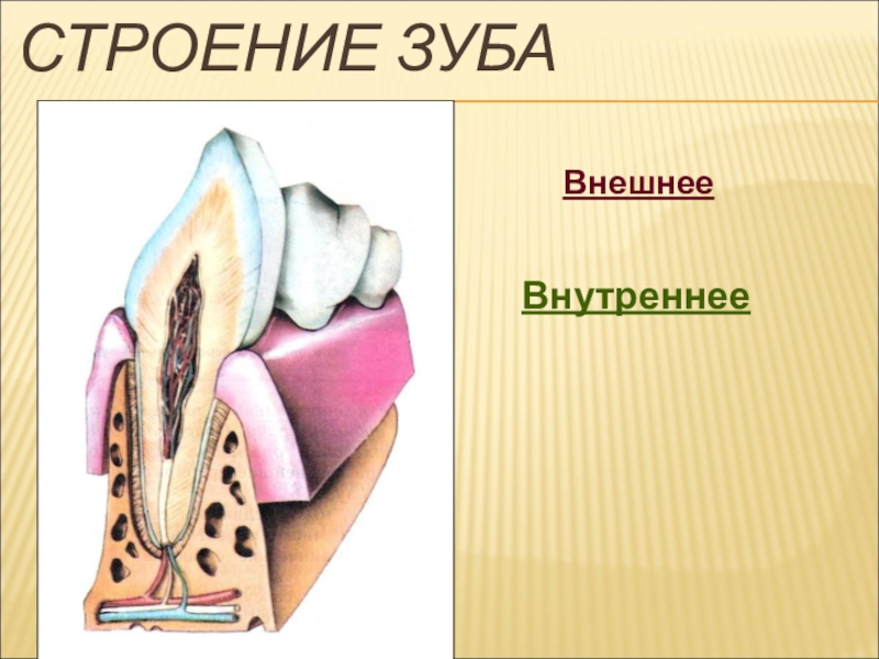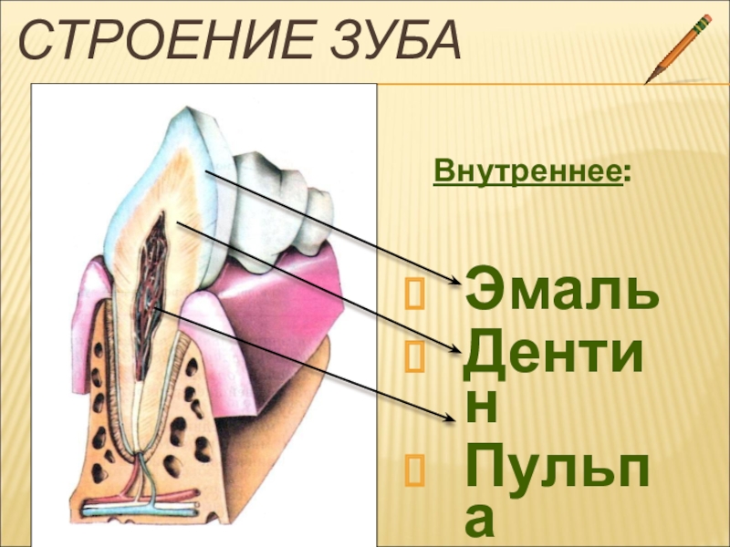 НАХОДИТСЯ ДЕНТИН– ПЛОТНОЕ КОСТНОПОДОБНОЕ ВЕЩЕСТВО. ВНУТРИ ЗУБА ИМЕЕТСЯ ПОЛОСТЬ, ЗАПОЛНЕННАЯ ПУЛЬПОЙ. ПУЛЬПА СОСТОИТ ИЗ СОЕДИНИТЕЛЬНОЙ ТКАНИ С РАСПОЛОЖЕННЫМИ В НЕЙ КРОВЕННОСНЫМИ СОСУДАМИ И НЕРВАМИ.