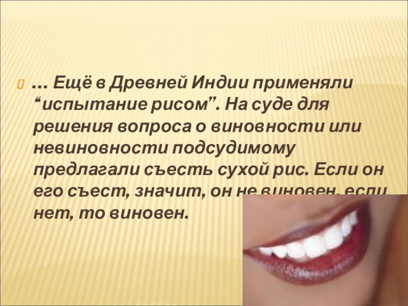 … Ещё в Древней Индии применяли “испытание рисом”. На суде для