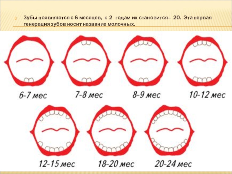 Зубы появляются с 6 месяцев, к 2 годам их становится–