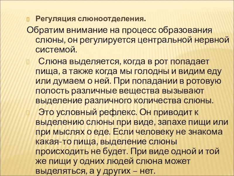 Слюна выделяется, когда в рот попадает пища, а также когда мы голодны и видим еду или думаем о ней. При попадании в ротовую полость различные вещества вызывают выделение различного количества слюны.