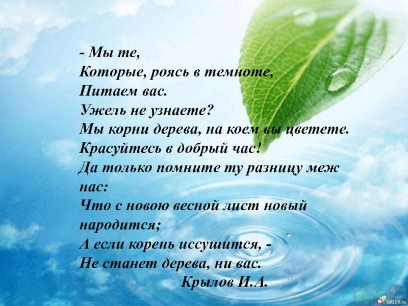 - Мы те,Которые, роясь в темноте,Питаем вас.Ужель не узнаете?Мы корни дерева, на коем вы цветете.Красуйтесь в добрый час!Да
