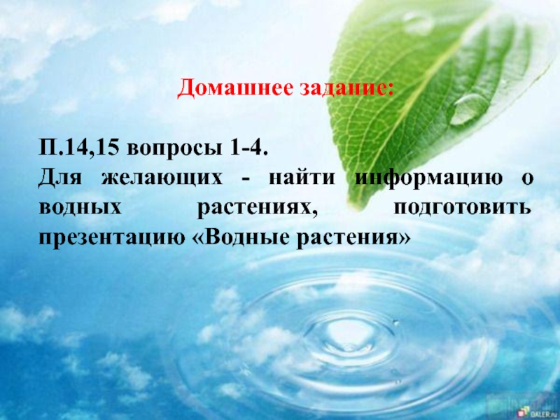 Домашнее задание:П.14,15 вопросы 1-4. Для желающих - найти информацию о водных растениях, подготовить презентацию «Водные растения»
