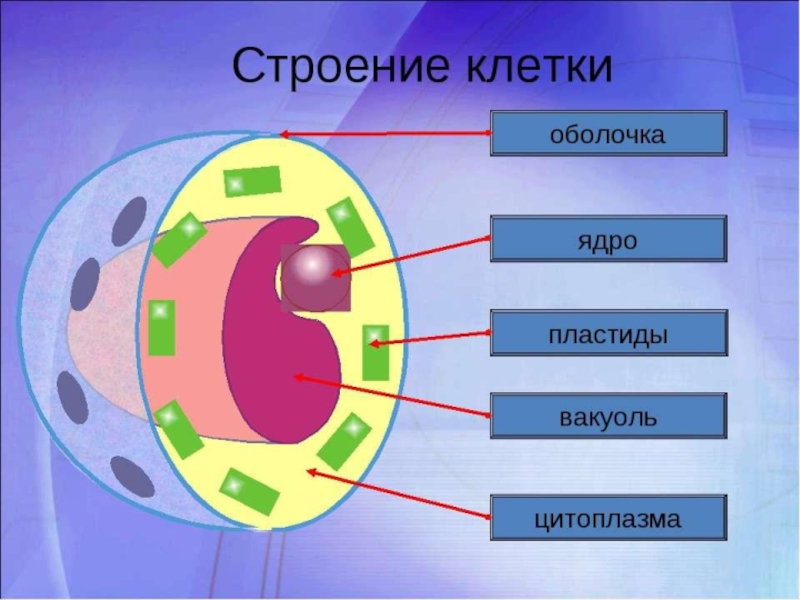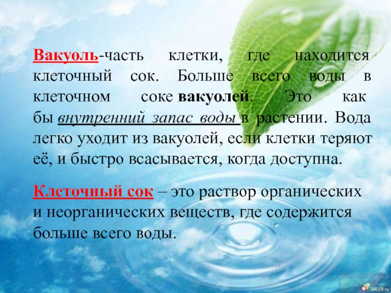 Слайд 6Вакуоль-часть клетки, где находится клеточный сок. Больше всего воды в клеточном