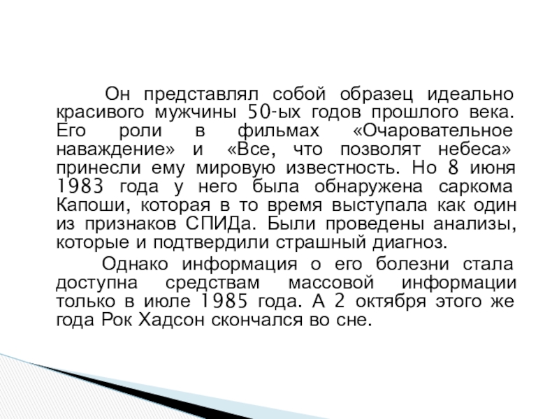 идеально красивого мужчины 50-ых годов прошлого века. Его роли в фильмах «Очаровательное наваждение» и «Все, что позволят небеса» принесли ему мировую известность. Но 8 июня 1983 года у него была обнаружена саркома Капоши, которая в то время выступала как один из признаков СПИДа. Были проведены анализы, которые и подтвердили страшный диагноз.