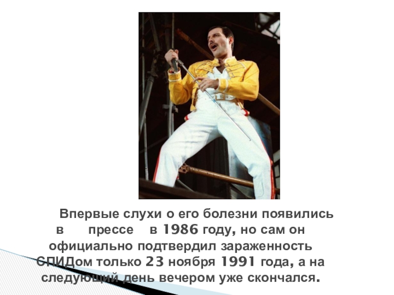в прессе в 1986 году, но сам он официально подтвердил зараженность СПИДом только 23 ноября 1991 года, а на следующий день вечером уже скончался.
