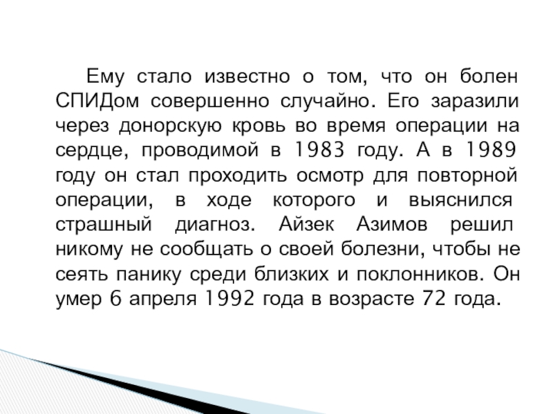совершенно случайно. Его заразили через донорскую кровь во время операции на сердце, проводимой в 1983 году. А в 1989 году он стал проходить осмотр для повторной операции, в ходе которого и выяснился страшный диагноз. Айзек Азимов решил никому не сообщать о своей болезни, чтобы не сеять панику среди близких и поклонников. Он умер 6 апреля 1992 года в возрасте 72 года.