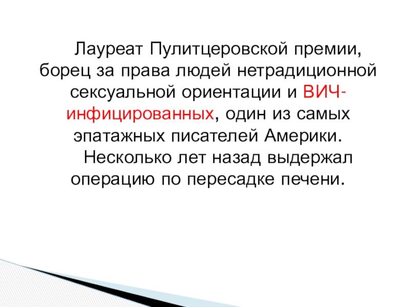 борец за права людей нетрадиционной сексуальной ориентации и ВИЧ-инфицированных, один из самых эпатажных писателей Америки.