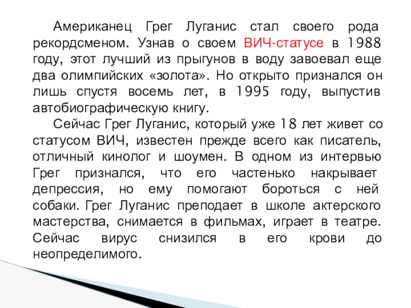 стал своего рода рекордсменом. Узнав о своем ВИЧ-статусе в 1988 году, этот лучший из прыгунов в воду завоевал еще два олимпийских «золота». Но открыто признался он лишь спустя восемь лет, в 1995 году, выпустив автобиографическую книгу.