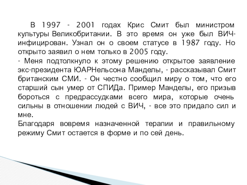 2001 годах Крис Смит был министром культуры Великобритании. В это время он уже был ВИЧ-инфицирован. Узнал он о своем статусе в 1987 году. Но открыто заявил о нем только в 2005 году.
