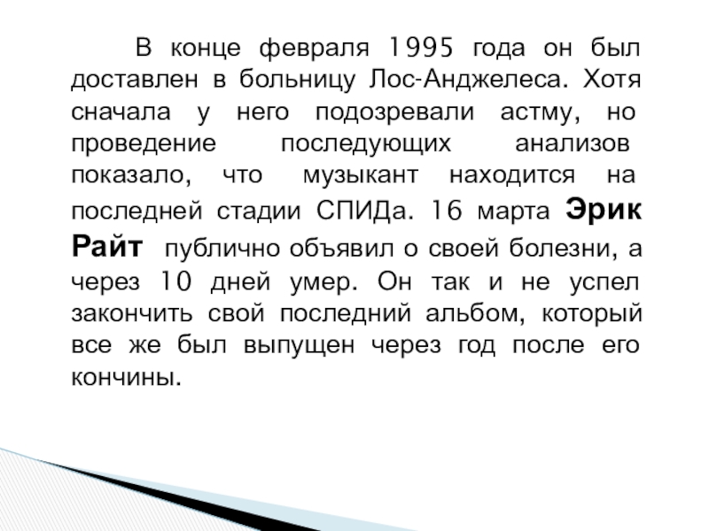 в больницу Лос-Анджелеса. Хотя сначала у него подозревали астму, но проведение последующих анализов показало, что музыкант находится на последней стадии СПИДа. 16 марта Эрик Райт публично объявил о своей болезни, а через 10 дней умер. Он так и не успел закончить свой последний альбом, который все же был выпущен через год после его кончины.