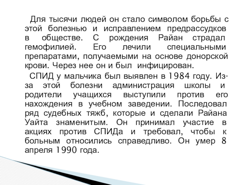 болезнью и исправлением предрассудков в обществе. С рождения Райан страдал гемофилией. Его лечили специальными препаратами, получаемыми на основе донорской крови. Через нее он и был инфицирован.