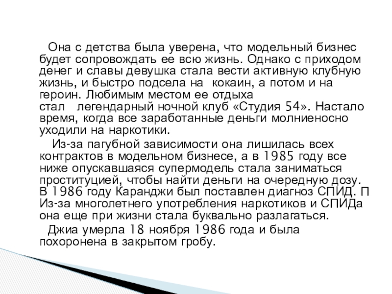 Слайд 14Джиа Каранджи была одна из самых первых супермоделей мира