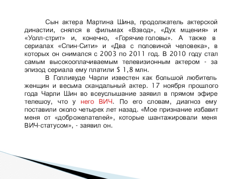 В Голливуде Чарли известен как большой любитель женщин и весьма скандальный актер. 17 ноября прошлого года Чарли Шин во всеуслышание заявил в прямом эфире телешоу, что у него ВИЧ. По его словам, диагноз ему поставили около четырех лет назад. «Мое признание избавит меня от «доброжелателей», которые шантажировали меня ВИЧ-статусом», - заявил он.