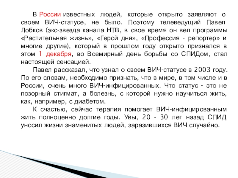 открыто заявляют о своем ВИЧ-статусе, не было. Поэтому телеведущий Павел Лобков (экс-звезда канала НТВ, в свое время он вел программы «Растительная жизнь», «Герой дня», «Профессия - репортер» и многие другие), который в прошлом году открыто признался в этом 1 декабря, во Всемирный день борьбы со СПИДом, стал настоящей сенсацией.