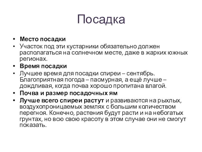 Лучшее время для посадки спиреи – сентябрь. Благоприятная погода – пасмурная, а ещё лучше – дождливая, когда почва хорошо пропитана влагой.