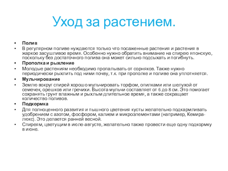 растения в жаркое засушливое время. Особенно нужно обратить внимание на спирею японскую, поскольку без достаточного полива она может сильно подсыхать и погибнуть.