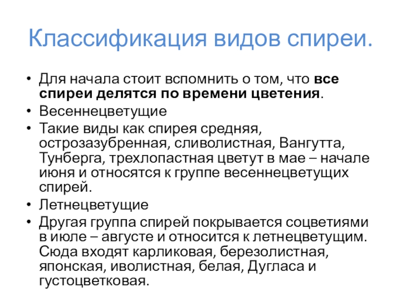 Такие виды как спирея средняя, острозазубренная, сливолистная, Вангутта, Тунберга, трехлопастная цветут в мае – начале июня и относятся к группе весеннецветущих спирей.