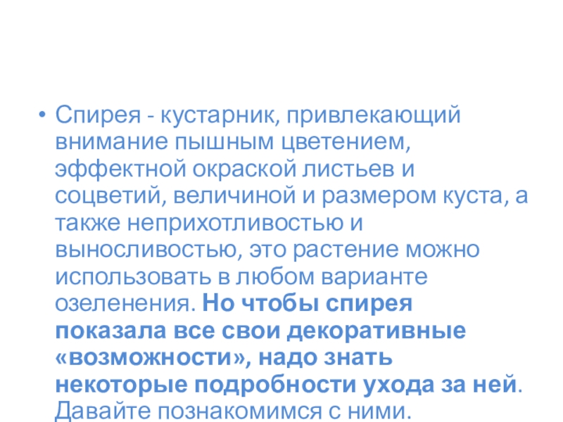Слайд 4Спирея - кустарник, привлекающий внимание пышным цветением, эффектной окраской листьев и