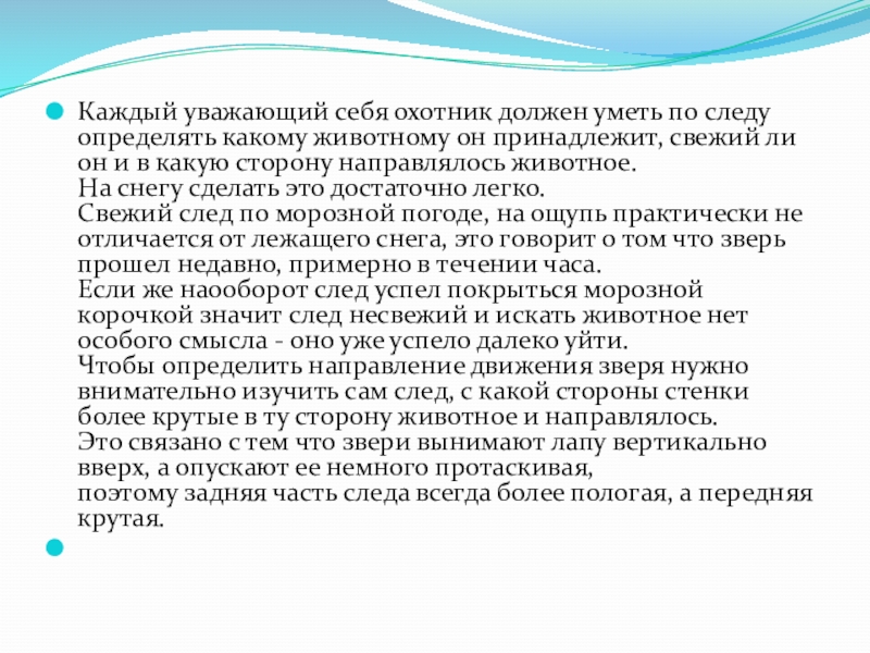 Слайд 4Каждый уважающий себя охотник должен уметь по следу определять какому животному