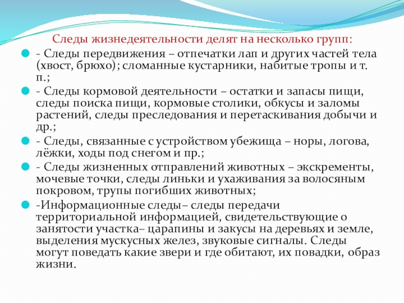 -Информационные следы– следы передачи территориальной информацией, свидетельствующие о занятости участка– царапины и закусы на деревьях и земле, выделения мускусных желез, звуковые сигналы. Следы могут поведать какие звери и где обитают, их повадки, образ жизни.