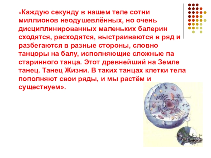 маленьких балерин сходятся, расходятся, выстраиваются в ряд и разбегаются в разные стороны, словно танцоры на балу, исполняющие сложные па старинного танца. Этот древнейший на Земле танец. Танец Жизни. В таких танцах клетки тела пополняют свои ряды, и мы растём и существуем».