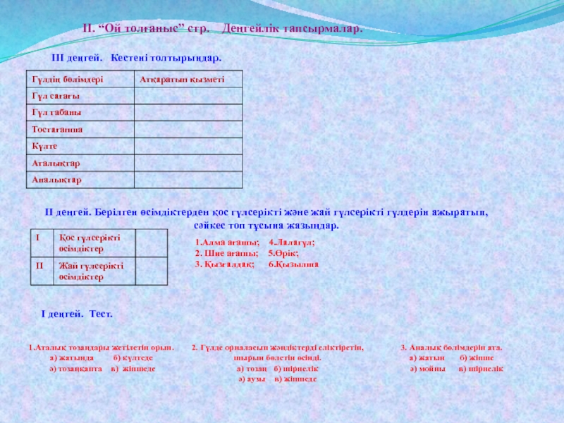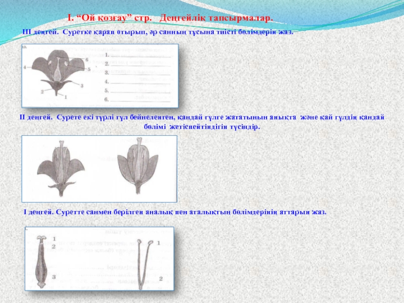 ІІ деңгей. Сурете екі түрлі гүл бейнеленген, қандай гүлге жататынын анықта және қай гүлдің қандай бөлімі жетіспейтіндігін түсіндір.