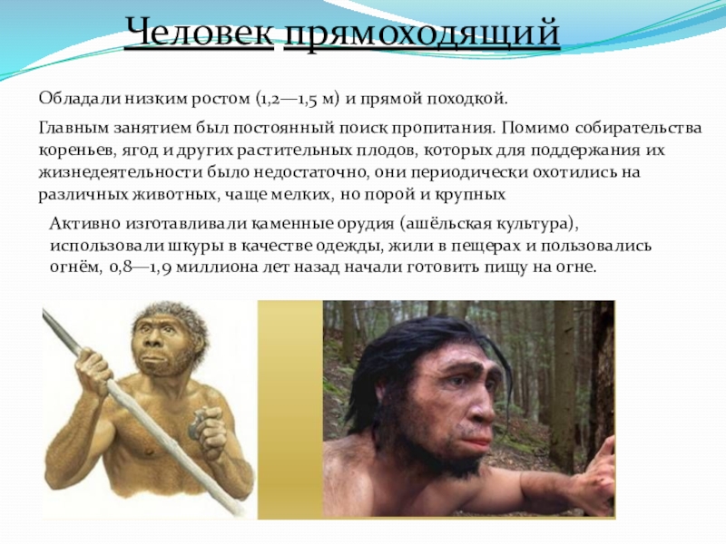 Активно изготавливали каменные орудия (ашёльская культура), использовали шкуры в качестве одежды, жили в пещерах и пользовались огнём, 0,8—1,9 миллиона лет назад начали готовить пищу на огне.
