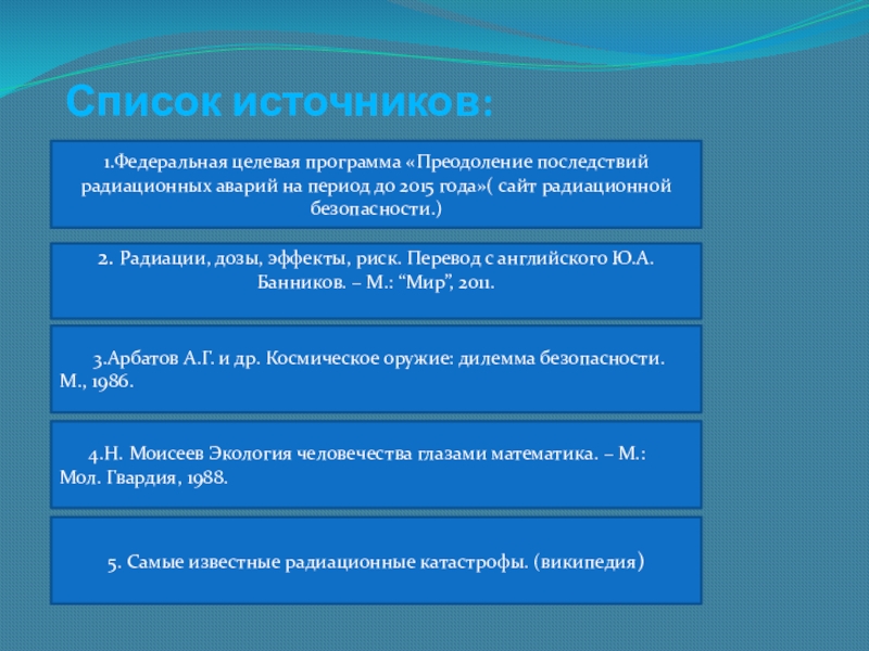 1.Федеральная целевая программа «Преодоление последствий радиационных аварий на период до 2015 года»( сайт радиационной безопасности.)