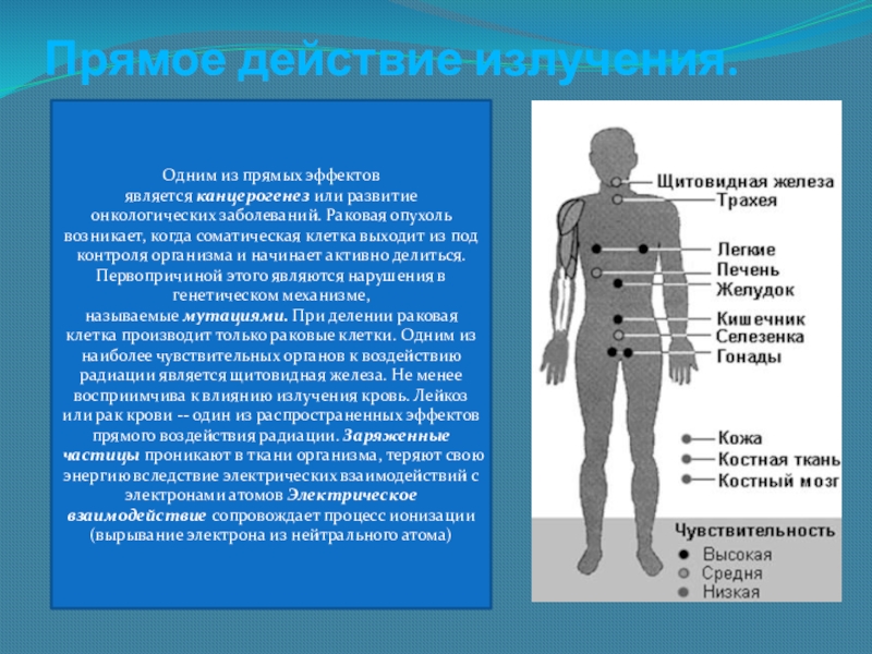 Различные органы живого организма имеют свою чувствительность к облучению. При ежедневном воздействии дозы 0,002-0,005 Гр уже наступают изменения в крови.