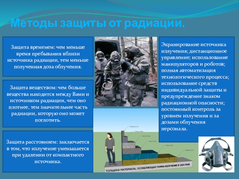 Экранирование источника излучения; дистанционное управление; использование манипуляторов и роботов; полная автоматизация технологического процесса; использование средств индивидуальной защиты и предупреждение знаком радиационной опасности; постоянный контроль за уровнем излучения и за дозами облучения персонала.