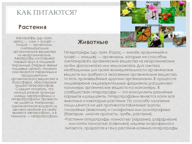 Растения-гетеротрофы полностью (заразиха, раффлезия) или почти полностью (повилика) лишены хлорофилла и питаются, прорастая в тело растения-хозяина.гетеротрофы