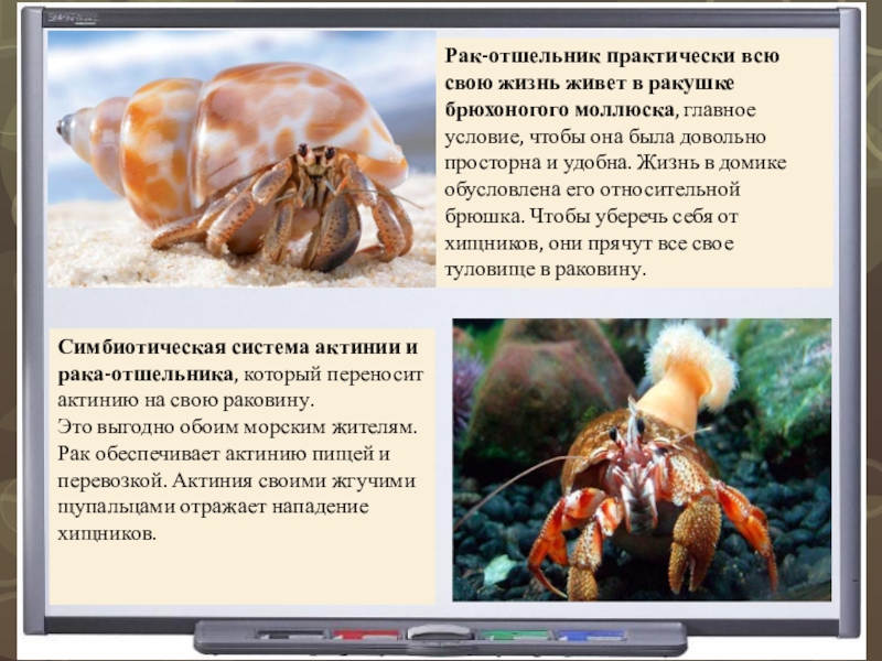 Это выгодно обоим морским жителям. Рак обеспечивает актинию пищей и перевозкой. Актиния своими жгучими щупальцами отражает нападение хищников.