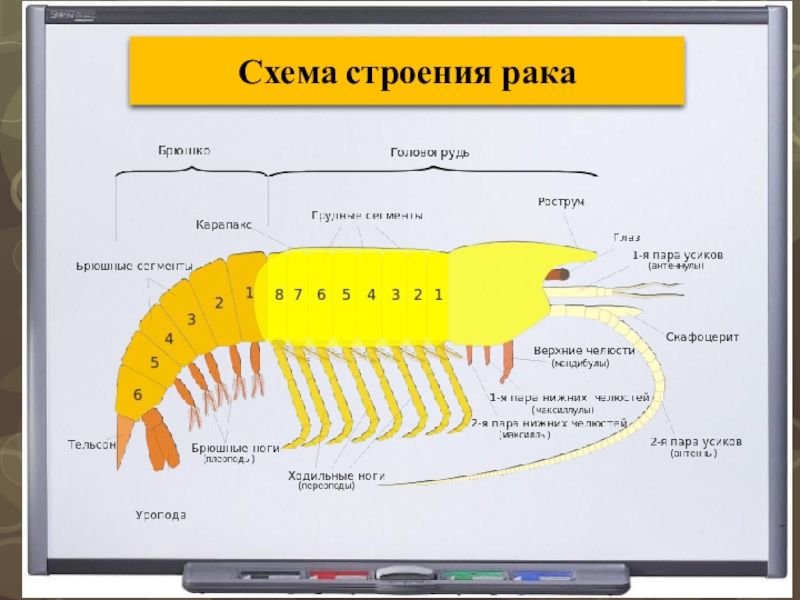 На груди расположены 5 пар ногочелюстей и 5 пар ходильных ног
