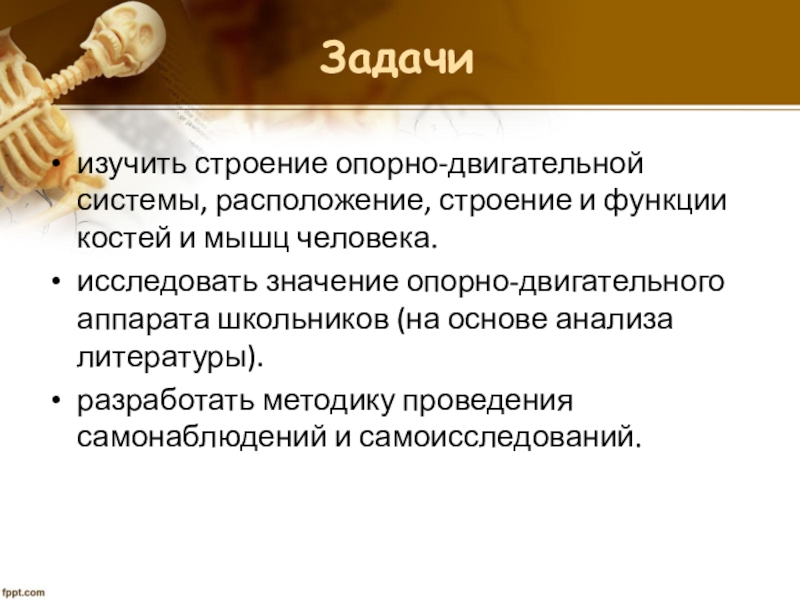 Задачиизучить строение опорно-двигательной системы, расположение, строение и функции костей и мышц человека.исследовать значение опорно-двигательного аппарата школьников (на