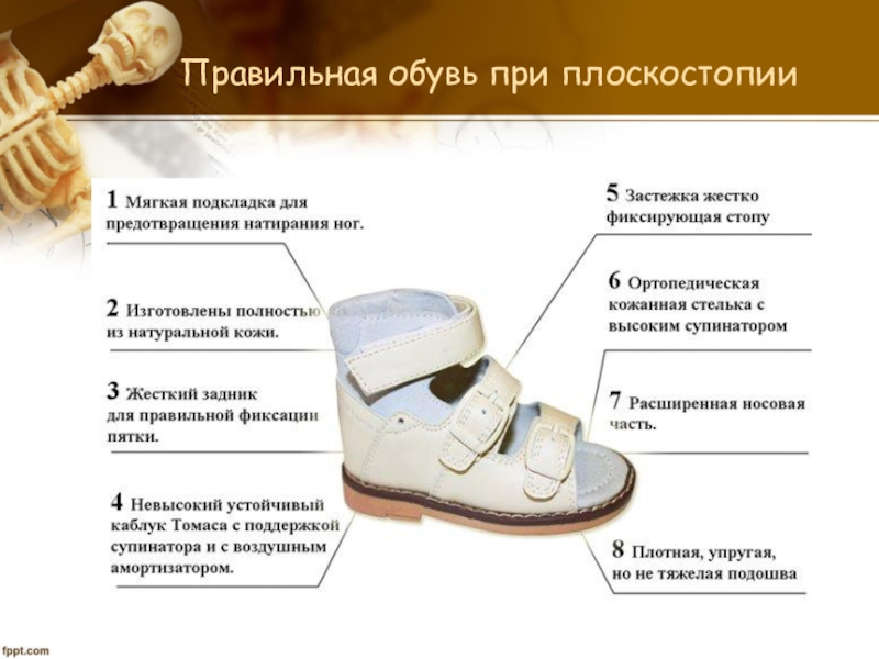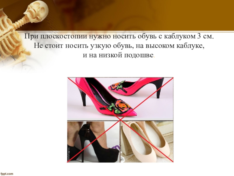 Слайд 10 При плоскостопии нужно носить обувь с каблуком 3 см. Не стоит носить